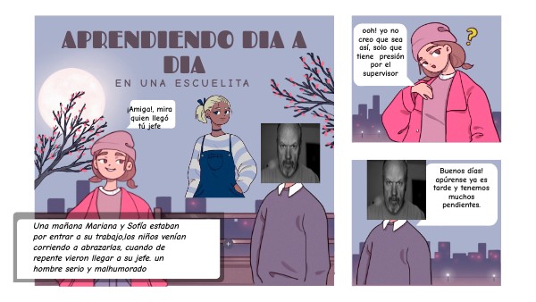 Una mañana Mariana y Sofía estaban por entrar a su trabajo,los niños venían corriendo a abrazarlas, cuando de repente vieron llegar a su jefe. un hombre serio y malhumorado
