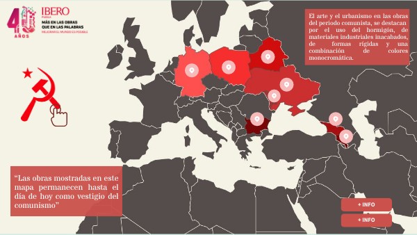El brutalismo soviético resalta formas geométricas y patrones repetitivos, dejando a la vista los materiales usados. Fue tendencia en los países comunistas, ya que se asoció a las ideologías de utopía social, las edificaciones no representaban lujos ni poder. (Sanzano, 2022). Pasó a ser también un símbolo del bloque comunista. Y por su solidez, materiales y costos, estas edificaciones siguen presentes hasta nuestros días, siendo uno de los legados más duraderos que dejó la URSS. (Cutieru, 2020). En los primeros murales estaban las victorias del comunismo y figuras políticas. En los 50’s ilustraban la aeronáutica, obreros e ideales de educación, deporte y disciplina. En países satélite plasmaban la amistad, apoyo y cooperación con la URSS (Kivanc, 2021). Con su colapso, la población veía propaganda y represión y no un valor artístico, por lo que fueron desmontados, repintados u olvidados, pero en ellos hay muchos de los valores que han moldeado estos países y son un reflejo de sus bases actuales (Granados, 2022) Todos los edificios mostrados en este mapa permanecen de pie hasta hoy.