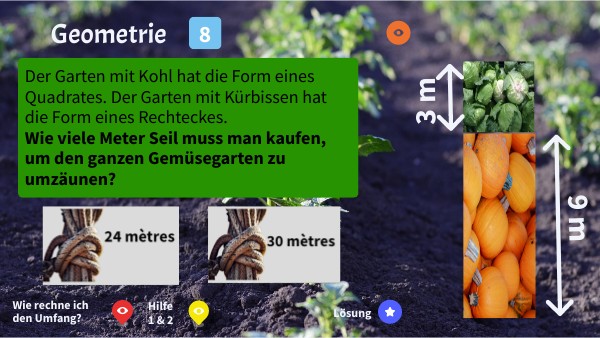 Der Garten mit Kohl hat die Form eines Quadrates. Der Garten mit Kürbissen hat die Form eines Rechteckes. Wie viele Meter Seil muss man kaufen, um den ganzen Gemüsegarten zu umzäunen?