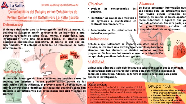 El tema de investigación busca exponer los posibles casos de bullying que pueden o hayan podido existir dentro de las instalaciones del Bachillerato. El proyecto tendrá un costo nulo. El interés general busca identificar las causas del bullying y como han afectado a los estudiantes que actualmente han sido víctimas de bullying.