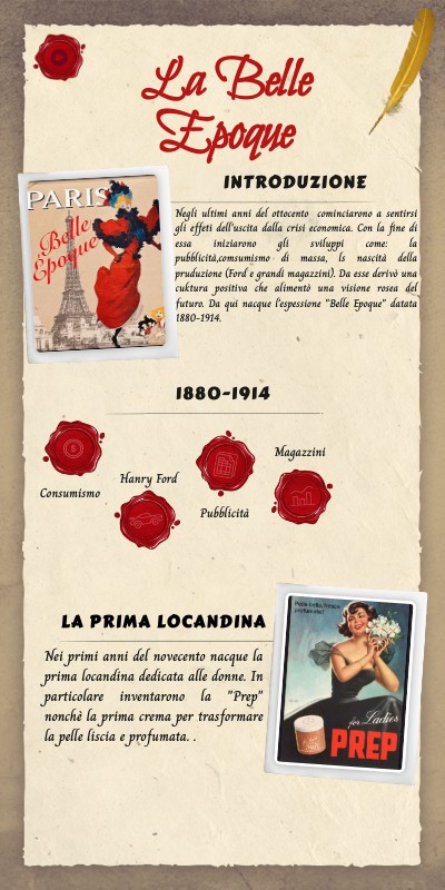 Negli ultimi anni del ottocento cominciarono a sentirsi gli effeti dell'uscita dalla crisi economica. Con la fine di essa iniziarono gli sviluppi come: la pubblicità,comsumismo di massa, ls nascità della pruduzione (Ford e grandi magazzini). Da esse derivò una cuktura positiva che alimentò una visione rosea del futuro. Da qui nacque l'espessione "Belle Epoque" datata 1880-1914.