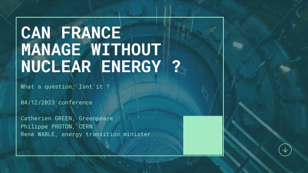 What a question, Isnt'it ?04/12/2023 conference Catherien GREEN, Greenpeace Philippe PROTON, CERN René WABLE, energy transition minister
