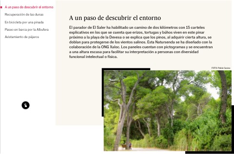 El parador de El Saler ha habilitado un camino de dos kilómetros con 15 carteles explicativos en los que se cuenta que erizos, tortugas y búhos viven en este pinar próximo a la playa de la Devesa o se explica que los pinos, al adquirir cierta altura, se doblan para protegerse de los vientos salinos. Esta Natursenda se ha diseñado con la colaboración de la ONG Xaloc. Los paneles cuentan con pictogramas y se encuentran a una altura escasa para facilitar su interpretación a personas con diversidad funcional intelectual o física.