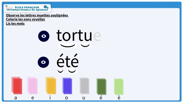 Observe les lettres muettes soulignées Colorie les sons voyelles Lis les mots