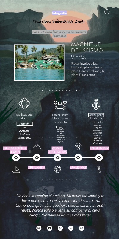 “le daba la espalda al océano. Mi novio me llamó y lo único que recuerdo es la expresión de su rostro. Comprendí que había que huir, pero la ola me atrapó” relata. Nunca volvió a ver a su compañero, cuyo cuerpo fue hallado un mes más tarde.