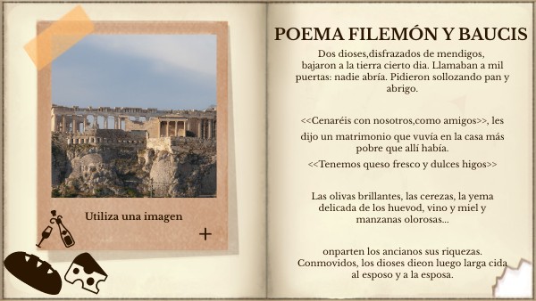 Dos dioses,disfrazados de mendigos, bajaron a la tierra cierto dia. Llamaban a mil puertas: nadie abría. Pidieron sollozando pan y abrigo. <<Cenaréis con nosotros,como amigos>>, les dijo un matrimonio que vuvía en la casa más pobre que allí había. <<Tenemos queso fresco y dulces higos>> Las olivas brillantes, las cerezas, la yema delicada de los huevod, vino y miel y manzanas olorosas... onparten los ancianos sus riquezas. Conmovidos, los dioses dieon luego larga cida al esposo y a la esposa.