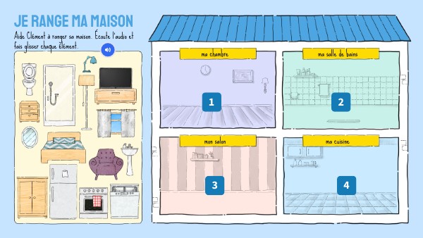 Aide Clément à ranger sa maison. Écoute l'audio et fais glisser chaque élément.