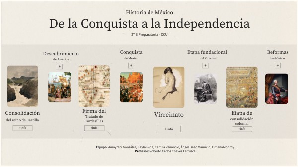 Antecedentes: Tuvo su antecedente en la invasión de Francia a España en 1808 y se extendió desde el grito de Dolores, el 16 de septiembre de 1810, hasta la entrada del Ejército Trigarante a la Ciudad de México, el 27 de septiembre de 1821. Un documento importante dentro de este proceso fue "Sentimientos de la Nación", dado a conocer por Morelos para plantear los ideales de la Independencia; entre ellos la soberanía del pueblo, la división de poderes y la abolición de la esclavitud. Quienes participan: Miguel Hidalgo, Ignacio Allende, Juan Aldama y José María Morelos. Consecuencias positivas: La Independencia tuvo como consecuencia positiva la creación de nuevas instituciones gubernamentales y sistemas legales, fortaleció el sentido de patriotismo y unidad entre los ciudadanos así como también llevó a cambios sociales significativos, como la abolición de la esclavitud o la implementación de medidas para garantizar una mayor igualdad. Consecuencias negativas: México enfrentó un periodo de inestabilidad política marcado por conflictos internos, luchas por el poder y cambios en la forma de gobierno, la economía se vio afectada debido a la interrupción del comercio y la agricultura, así como la acumulación de deudas, también la sociedad mexicana enfrentó desafíos sociales, como tensiones entre diferentes grupos étnicos y clases sociales, que a veces se intensificaron durante y después de la guerra.