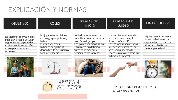 Los policías capturan a los ladrones tocánolos y los llevan a la "cárcel" Los ladrones encarcelados pueden ser rescatados si otro ladron liberado le choca la mano mientras que lo llevan a la cárcel