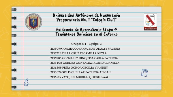 2135099 ANCIRA COVARRUBIAS ODALYS VALERIA 2135728 DE LA CRUZ ESCAMILLA KEYLA 2136785 GONZALEZ HINOJOSA CARLA PATRICIA 2135408 GUEDEA GONZALEZ IRLANDA DANIELA 2136569 PEÑA OCHOA CECILIA VIANNEY 2135076 SOLIS CUELLAR PATRICIA ABIGAIL 2136515 VAZQUEZ MURILLO JORGE ISAAC
