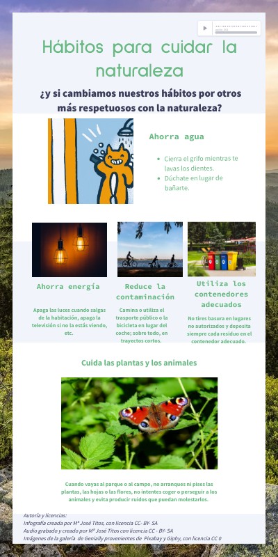 Autoría y licencias: Infografía creada por Mª José Titos, con licencia CC- BY- SA Audio grabado y creado por Mª José Titos con licencia CC - BY- SA Imágenes de la galería de Genially provenientes de Pixabay y Giphy, con licencia CC 0