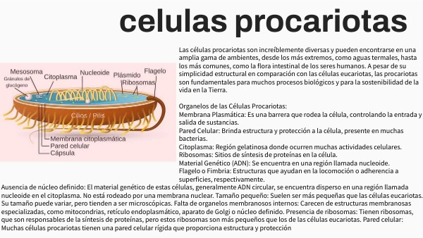Las células procariotas son increíblemente diversas y pueden encontrarse en una amplia gama de ambientes, desde los más extremos, como aguas termales, hasta los más comunes, como la flora intestinal de los seres humanos. A pesar de su simplicidad estructural en comparación con las células eucariotas, las procariotas son fundamentales para muchos procesos biológicos y para la sostenibilidad de la vida en la Tierra. Organelos de las Células Procariotas: Membrana Plasmática: Es una barrera que rodea la célula, controlando la entrada y salida de sustancias. Pared Celular: Brinda estructura y protección a la célula, presente en muchas bacterias. Citoplasma: Región gelatinosa donde ocurren muchas actividades celulares. Ribosomas: Sitios de síntesis de proteínas en la célula. Material Genético (ADN): Se encuentra en una región llamada nucleoide. Flagelo o Fimbria: Estructuras que ayudan en la locomoción o adherencia a superficies, respectivamente.