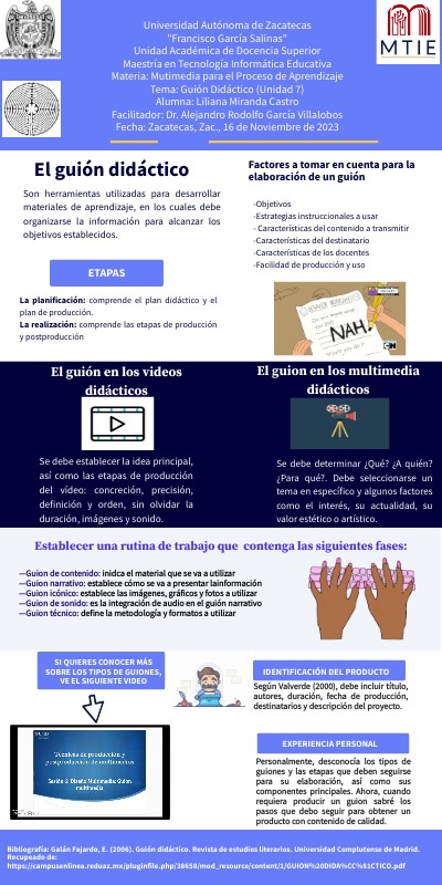 Universidad Autónoma de Zacatecas"Francisco García Salinas" Unidad Académica de Docencia Superior Maestría en Tecnología Informática Educativa Materia: Mutimedia para el Proceso de Aprendizaje Tema: Guión Didáctico (Unidad 7) Alumna: Liliana Miranda Castro Facilitador: Dr. Alejandro Rodolfo García Villalobos Fecha: Zacatecas, Zac., 16 de Noviembre de 2023