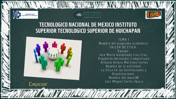 TEMA 1 Nombre del programa académico: TALLER DE ETICA. Equipo: Jose María Guadalupe Cruz Cruz. Rigoberto Hernández Campistrano. Alfonso Arturo Martinez Cortez Nombre de la actividad: La Etica en las Instituciones y Organizaciones Nombre del maest@: Luis Miguel Cortes Ibarra