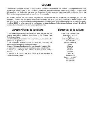 La cultura es una construcción social que tiene que ver con un espacio geográfico, político, económico y lo forman las dinámicas sociales.Las constumbres, tradiciones y conocimientos se transmiten de generación en generación. Es un producto exclusivamente humano, los animales no presentan algo que podamos llamar cultura. Es aprendida y aprehendida por los miembros del grupo social. La construyen elementos tanto materiales como inmateriales. Es diversa: no existe algo como cultura universal y única, existen muchas. Es dinámica: se transforma de acuerdo a las necesidades e interacciones del grupo.