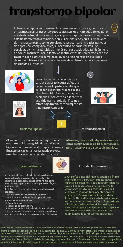 El trastorno bipolar entorno mental que es generado por alguna alteración en los mecanismos del cerebro los cuales son los encargados de regular el estado de ánimo de una persona, esto provoca que la persona que padece este trastorno tenga alteraciones en su personalidad y en sus emociones de manera constante como por ejemplo: pueden tener grandes periodos de depresión, energía excesiva, su necesidad de dormir disminuye considerablemente, pérdida de interés por sus actividades, también tiene episodios maníacos. Por lo tanto los sentimientos de una persona con ese trastorno son bastante cambiantes pues hay momentos en que están demasiado felices y activos para después de un tiempo estar sumamente deprimidos o irritables.