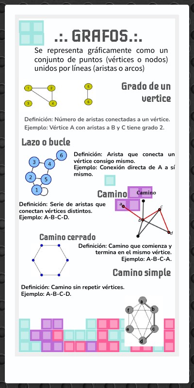 Se representa gráficamente como un conjunto de puntos (vértices o nodos) unidos por líneas (aristas o arcos)