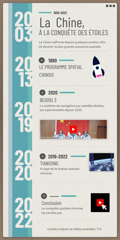 Le 1er novembre 2022, la Chine a fini l’assemblage du dernier module de sa station spatiale nommée Tiangong. Elle avait pour projet de faire sa propre station spatiale notamment après le refus des Etats-Unis de les faire entrer dans l’ISS. Pour les concurrencer, la Chine veut donc ouvrir sa station à d’autres pays comme des pays en développement. 2 autres versions de Tiangong ont vu le jour avant, avec entre autre en 2016 le lancement de Tiangong 2 qui a été lancée en prévision de la désintégration de la première lors de son entrée dans l’atmosphère.