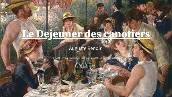 Le Déjeuner des canotiers est une huile sur toile impressioniste peinte par Auguste Renoir entre 1880 et 1881 qui représente les amis et camarades du célèbre peintre regroupés sur la terrasse d'un restaurant de la banlieue parisienne. Ils discutent et s'amusent. Renoir nous montre une realité du 19ème siècle et le bon coté des choses. Il insiste sur l'importance de la diversité sociale et de savoir prendre du temps pour sois, se rejouir, etre heureux.