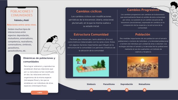 Existen muchos tipos de interacciones entre especies: depredación, mutualismo, amensalismo, competencia, neutralismo, comensalismo, simbiosis, parasitismo, parasitoidismo, etc.
