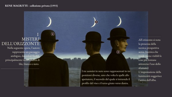 Dapprima avvicinatosi al futurismo e al cubismo, Rene Magritte divenne in seguito uno dei maggiori esponenti del Surrealismo, ”la corrente del sogno”, che sviscera l’onirico riportandocelo alla realtà e che allo stesso tempo mantiene quel gusto e quell’aura di mistero che è sempre presente nel mondo dei sogni. Magritte si rivela l’artista che, spostando di senso i più comuni oggetti, li riporta ad una realtà altra, mostrandoceli nelle loro forme meno banali possibili e invitandoci a guardare sempre con un diverso appiglio le varie situazioni. Ma quando i suoi oggetti si trasformano, si associano e perdono la loro funzione abituale e rassicurante, allora l’osservatore si ritrova di colpo in una nuova realtà, che comincia a sfuggirgli di mano, che non riesce più a controllare. Quando Magritte utilizza la “chiave dei sogni” per spalancare le porte dell’immaginazione, allora le foglie diventano degli alberi le punte delle scarpe si trasformano in piedi umani e il paesaggio rimane definitivamente impresso sui cocci di vetro di una finestra, caduti per terra. Il surrealismo di Magritte è un surrealismo emblematico e nello stesso tempo poetico, fatto di immagini banali e inverosimili, semplici e sconcertanti, che sorprendono la mente e accendono la fantasia. La pittura esplora l’inconscio e il mondo dei sogni, oltrepassando il “regno della logica”.