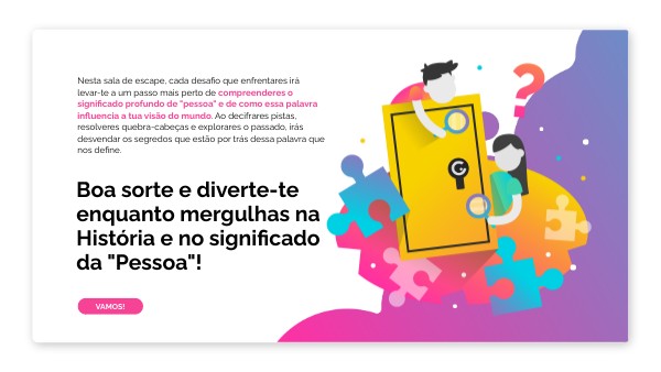 Nesta sala de escape, cada desafio que enfrentares irá levar-te a um passo mais perto de compreenderes o significado profundo de "pessoa" e de como essa palavra influencia a tua visão do mundo. Ao decifrares pistas, resolveres quebra-cabeças e explorares o passado, irás desvendar os segredos que estão por trás dessa palavra que nos define.