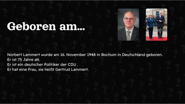 Norbert Lammert wurde am 16. November 1948 in Bochum in Deutschland geboren. Er ist 75 Jahre alt. Er ist ein deutscher Politiker der CDU . Er hat eine Frau, sie heißt Gertrud Lammert.