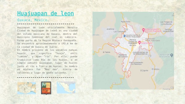 Huajuapan de León oficialmente Heroica Ciudad de Huajuapan de León5 es una ciudad del estado mexicano de Oaxaca, dentro del municipio homónimo del cual es cabecera. Forma parte de la Región Mixteca Oaxaqueña. Se encuentra aproximadamente a 192.6 km de la ciudad de Oaxaca de Juárez.El nombre proviene de los vocablos nahuas huaxin, que significa "huaje", ohtli "camino", y apan "río". Por ello, puede traducirse como Río de los huajes, o en simple náhuatl Guaxoapan, lugar de huajes junto al río o Tierra de huajes. Su nombre en mixteco fue "Ñuu dee", tierra de valientes o lugar de gente valiente.
