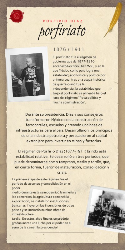 El porfiriato fue el régimen de gobierno que de 1877-1910 encabezó Porfirio Díaz Mori, y en la que México como país logra una estabilidad, económica y política por primera vez, tras una etapa histórica de guerra como fue la independencia, la estabilidad que trajo el porfiriato se alineaba bajo el lema del régimen: ”Poca política y mucha administración”.