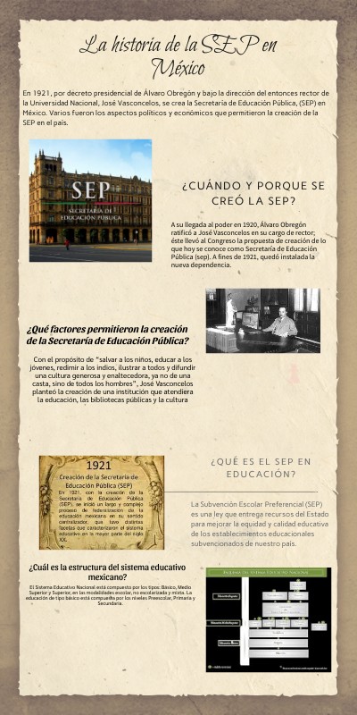 En 1921, por decreto presidencial de Álvaro Obregón y bajo la dirección del entonces rector de la Universidad Nacional, José Vasconcelos, se crea la Secretaría de Educación Pública, (SEP) en México. Varios fueron los aspectos políticos y económicos que permitieron la creación de la SEP en el país.