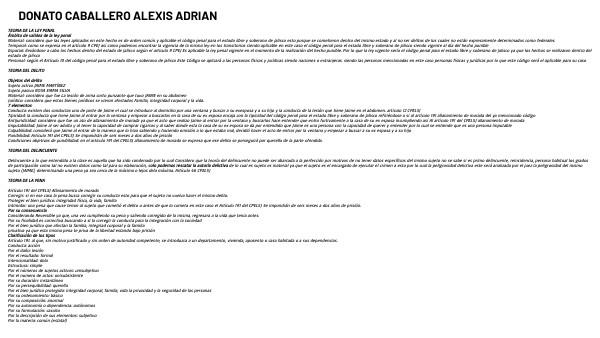 TEORIA DE LA LEY PENAL Ámbito de validez de la ley penal Material: considero que las leyes aplicadas en este hecho es de orden común y aplicable el código penal para el estado libre y soberano de jalisco esto porque se cometieron dentro del mismo estado y al no ser delitos de los cuales no están expresamente determinados como federales. Temporal: como se expresa en el artículo 9 CPEJ así como podemos encontrar la vigencia de la misma ley en los transitorios siendo aplicable en este caso el código penal para el estado libre y soberano de jalisco siendo vigente al día del hecho punible Espacial: llevándose a cabo los hechos dentro del estado de jalisco según el articulo 9 CPEJ Es aplicable la ley penal vigente en el momento de la realización del hecho punible. Por lo que la ley vigente sería el código penal para el estado libre y soberano de jalisco ya que los hechos se realizaron dentro del estado de jalisco Personal: según el Artículo 10 del código penal para el estado libre y soberano de jalisco Este Código se aplicará a las personas físicas y jurídicas siendo naciones o extranjeras. siendo las personas mencionadas en este caso personas físicas y jurídicas por lo que este código será el aplicable para su caso TEORIA DEL DELITO Objetos del delito Sujeto activo JAIME MARTÍNEZ Sujeto pasivo ROSA EMMA SILVA Material: considero que fue La lesión de arma corto punzante que tuvo JAIME en su abdomen Jurídico: considero que estos bienes jurídicos se vieron afectados Familia, integridad corporal y la vida. 7 elementos Conducta: existen dos conductas una de parte de Jaime el cual se introduce al domicilio por una ventana y buscar a su exesposa y a su hijo y la conducta de la lesión que tiene Jaime en el abdomen. articulo 12 CPELSJ Tipicidad: la conducta que tiene Jaime al entrar por la ventana y empezar a buscarlos en la casa de su ex esposa encaja con la tipicidad del código penal para el estado libre y soberano de jalisco refiriéndose a si al artículo 191 allanamiento de morada del ya mencionado código Antijuridicidad: considero que fue un ato de allanamiento de morada ya que el acto que realizo Jaime al entrar por la ventana y buscarlos hace entender que entro furtivamente a la casa de su ex esposa incumpliendo así Al artículo 191 del CPELSJ allanamiento de morada Imputabilidad: Jaime al ser adulto y al tener la capacidad de comprar cigarros y al saber donde esta la casa de su ex esposa se da por entendido que Jaime es una persona con la capacidad de querer y entender por lo cual se entiende que es una persona imputable Culpabilidad: consideró que Jaime al entrar de la manera que lo hizo sabiendo y haciendo omisión a lo que estaba mal, decidió hacer el acto de entrar por la ventana y empezar a buscar a su ex esposa y a su hijo Punibilidad: Artículo 191 del CPELSJ Se impondrán de seis meses a dos años de prisión Condiciones objetivas de punibilidad: en el articulo 191 del CPELSJ allanamiento de morada se expresa que ese delito se perseguirá por querella de la parte ofendida. TEORIA DEL DELINCUENTE Delincuente a lo que entendido a la clase es aquella que ha sido condenado por lo cual Considero que la teoría del delincuente no puede ser abarcada a la perfección por motivos de no tener datos específicos del mismo sujeto no se sabe si es primo delincuente, reincidencia, persona habitual los grados de participación como tal no existen datos como tal para su elaboración, solo podemos rescatar la autoría delictiva de lo cual es sujeto es material ya que el sujeto es el encargado de ejecutar el crimen a esto por lo cual la peligrosidad delictiva este será analizada por el juez la peligrosidad del mismo sujeto (JAIME), determinando una pena ya sea cerca de la máxima o lejos dela máxima. Artículo 46 CPELSJ TEORIA DE LA PENA Artículo 191 del CPELSJ Allanamiento de morada Corregir: si en ese caso la pena busca corregir su conducta esto para que el sujeto no vuelva hacer el mismo delito. Proteger el bien jurídico: integridad física, la vida, familia Intimidar: una pena que cause temor al sujeto que cometió el delito o antes de que lo cometa en este caso el Artículo 191 del CPELSJ Se impondrán de seis meses a dos años de prisión. Por su consecuencia Considerando Reversible ya que, una vez cumpliendo su pena y saliendo corregido de la misma, regresara a la vida que tenia antes. Por su finalidad es correctiva buscando a si la corregir la conducta para la integración con la sociedad Por el bien jurídico que afectan la familia, integriad corporal y la familia privativa ya que esta misma pena te priva de la libertad estando bajo prisión Clasificación de los tipos Artículo 191. al que, sin motivo justificado y sin orden de autoridad competente, se introduzca a un departamento, vivienda, aposento o casa habitada o a sus dependencias. Conducta: acción Por el daño: lesión Por el resultado: formal Intencionalidad: dolo Estructura: simple Por el números de sujetos activos: unisubjetivo Por el numero de actos: unisubsistente Por su duración: instantáneo Por su persequibilidad: querella Por el bien jurídico protegido: integridad corporal, familia, vida la privacidad y la seguridad de las personas Por su ordenamiento: básico Por su composición: anormal Por su autonomía o dependencia: autónomos Por su formulación: casuito Por la descripción de sus elementos: subjetivo Por la materia: común (estatal)