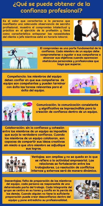 Colaboración: sin la confianza y cohesión entre los miembros de un equipo es imposible que surja la verdadera confianza. Cuando los miembros de un equipo colaboran, son capaces de compartir sus ideas creativas sin miedo a que otro miembro se adjudique sus logros.