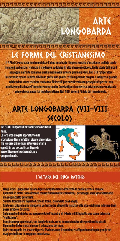 Nel 568 i Longobardi si stabiliscono nel Nord Italia.La loro arte è legata soprattutto alla produzione di manufatti di piccole dimensioni. Tra le opere più comuni si trovano altari e oggetti in oro decorati con figure in bassorilievo molto schematiche e sproporzionate.