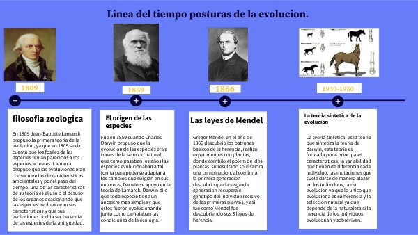 En 1809 Jean-Baptiste Lamarck propuso la primera teoria de la evolucion, ya que en 1809 se dio cuenta que los fosiles de las especies tenian parecidos a los especies actuales. Lamarck propuso que las evoluviones eran consecuencias de caracteristicas ambientales y por el paso del tiempo, una de las caracteristicas de su teoria es el uso o el desuso de los organos ocasionando que las especies evoluvinaran sus caracteristicas y que sus evoluciones podria ser herencia de las especies de la antiguedad.
