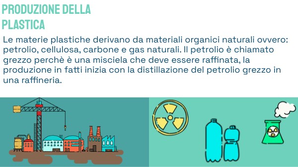 Le materie plastiche derivano da materiali organici naturali ovvero: petrolio, cellulosa, carbone e gas naturali. Il petrolio è chiamato grezzo perchè è una misciela che deve essere raffinata, la produzione in fatti inizia con la distillazione del petrolio grezzo in una raffineria.