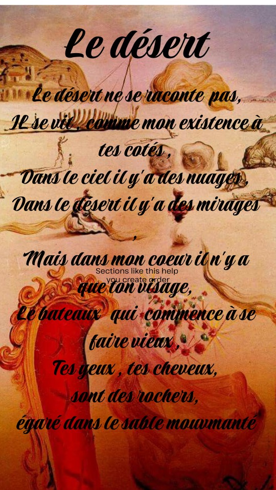 Le désert ne se raconte pas,IL se vit , comme mon existence à tes cotés , Dans le ciel il y'a des nuages , Dans le désert il y'a des mirages , Mais dans mon coeur il n'y a que ton visage, Le bateaux qui commence à se faire vieux , Tes yeux , tes cheveux, sont des rochers, égaré dans le sable mouvmanté