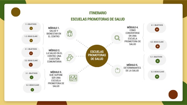 En el último módulo se estructuran una serie de referentes y ejemplos que atienden a distintas dimensiones dentro del concepto de salud, teniendo en cuenta los determinantes de la misma y la Guía EPrS que plantea 6 líneas de acción. Así, podrán comprender cómo analizar la salud y el bienestar en un centro educativo desde distintos parámetros dentro de una visión positiva y la relación con las competencias claves y específicas del currículo de cara a priorizar según qué actuaciones en el contexto de su centro educativo.