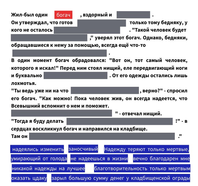 Жил-был один , вздорный и . Он утверждал, что готов только тому бедняку, у кого не осталось . "Такой человек будет ," уверял этот богач. Однако, бедняки, обращавшиеся к нему за помощью, всегда ещё что-то . В один момент богач обрадовался: "Вот он, тот самый человек, которого я искал!" Перед ним стоял нищий, еле передвигающий ноги и буквально . От его одежды остались лишь лохмотья. "Ты ведь уже ни на что , верно?" - спросил его богач. "Как можно! Пока человек жив, он всегда надеется, что Всевышний вспомнит о нем и поможет. " - отвечал нищий. "Тогда я буду делать !" - в сердцах воскликнул богач и направился на кладбище. Там он ."