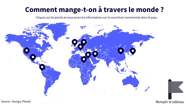 Cliquez sur les points et vous aurez les informations sur la nourriture consommée dans le pays.
