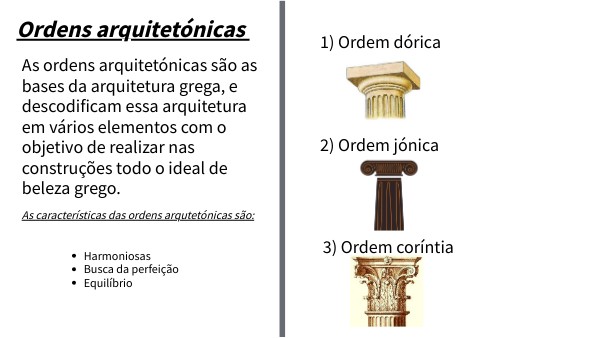 As ordens arquitetónicas são as bases da arquitetura grega, e descodificam essa arquitetura em vários elementos com o objetivo de realizar nas construções todo o ideal de beleza grego.