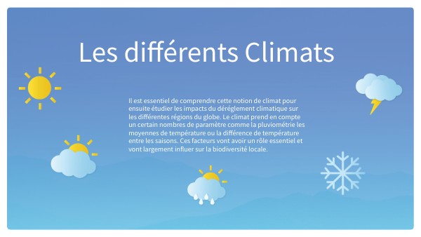 Il est essentiel de comprendre cette notion de climat pour ensuite étudier les impacts du déréglement climatique sur les différentes régions du globe. Le climat prend en compte un certain nombres de paramètre comme la pluviométrie les moyennes de température ou la différence de température entre les saisons. Ces facteurs vont avoir un rôle essentiel et vont largement influer sur la biodiversité locale.