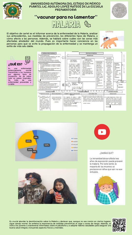 El objetivo de cartel es el informar acerca de la enfermedad de la Malaria, analizar sus antecedentes, sus medidas de prevención, los diferentes tipos de Malaria, y cómo afecta a las personas. Además, se hablará sobre cuáles son las zonas más afectadas alrededor del mundo. Pues es importante hacer conciencia en las personas para que se evite la propagación de la enfermedad y se mantenga un estilo de vida salu dable.