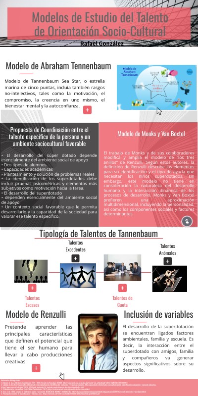 Referencias Bibliográficas1. Blumen, S. (n.d.). Abraham Tannenbaum: 1924 - 2014. Revista de Psicología (PUCP). http://www.scielo.org.pe/scielo.php?script=sci_arttext&pid=S0254-92472015000100009 2. cdg52g. (n.d.). Altas Capacidades Intelectuales:Conceptualización, Identificación, evaluación y respuesta educativa. Altas capacidades intelectuales: conceptualización, identificación, evaluación y respuesta educativa. https://www.carm.es/edu/pub/19638_2019/pub_contenido_03_modelos-explicativos-de-las-altas-capacidades.html 3. El Modelo de los tres anillos. Centro Altas Capacidades. (2017). https://centrorenzulli.es/es/el-modelo-de-los-tres-anillos/ 4. Arco, J. de. (1970, January 1). Modelo de monks y van boxtel. MODELO DE MONKS Y VAN BOXTEL. http://altascapacidadeseneducacioninfantil.blogspot.com/2014/06/modelo-de-monks-y-van-boxtel.html 5. Principales modelos de Superdotación y Talentos. (n.d.). https://www.tdx.cat/bitstream/handle/10803/10993/SanchezLopez04de12.pdf