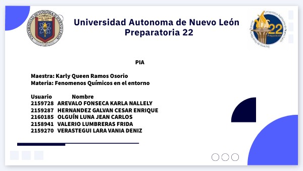 PIA Maestra: Karly Queen Ramos Osorio Materia: Fenomenos Químicos en el entorno Usuario Nombre 2159728 AREVALO FONSECA KARLA NALLELY 2159287 HERNANDEZ GALVAN CESAR ENRIQUE 2160185 OLGUÍN LUNA JEAN CARLOS 2158941 VALERIO LUMBRERAS FRIDA 2159270 VERASTEGUI LARA VANIA DENIZ