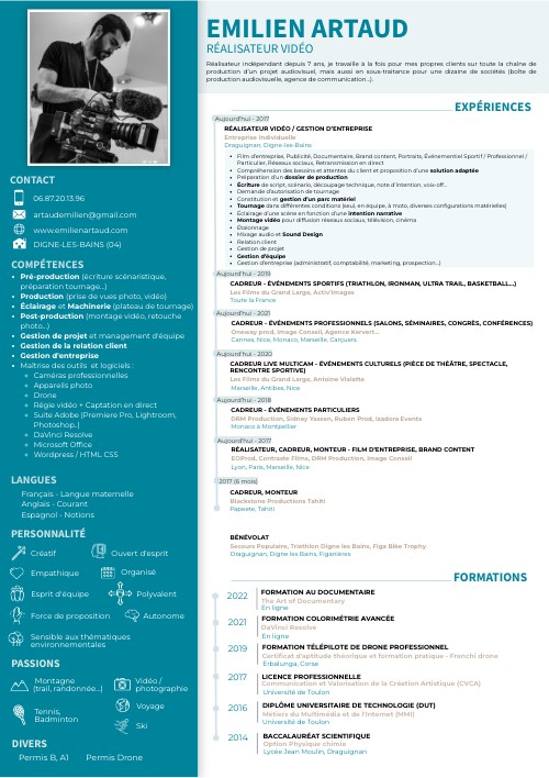 Réalisateur indépendant depuis 7 ans, je travaille à la fois pour mes propres clients sur toute la chaîne de production d’un projet audiovisuel, mais aussi en sous-traitance pour une dizaine de sociétés (boîte de production audiovisuelle, agence de communication…).