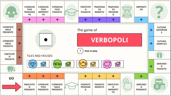 Preparazione Ogni giocatore (o squadra) deve scegliere l’immagine da utilizzare come pedina e posizionarlo sulla casella VIA. Posizionare le carte VERBI E LE CARTE ANALIZZA. Il dado ha due funzioni: indica di quante caselle avanzare e quale persona utilizzare per coniugare i verbi. Il numero indicato corrisponde alla persona: 1: io 2: tu 3: egli 4: noi 5: voi 6: essi Come si gioca Il giocatore lancia il dado e muove la propria pedina di tante caselle quante indicate dal dado. In base alla casella su cui si atterra si deve svolgere una precisa attività: caselle con il bordo colorato: pescare una carta verbi e declinare il verbo scritto sulla carta al tempo indicato nella casella e alla persona indicata dal dado; caselle analizza: pescare una carta ANALIZZA e fare l’analisi della forma verbale indicata. Sul tabellone trovate altre caselle con indicazioni di gioco per lanciare nuovamente il dado o spostarvi sul tabellone. Chi vince? Ogni volta che il giocatore coniuga correttamente il verbo o analizza correttamente la forma verbale può conservare la carta come punto. Al termine del tempo disponibile o delle carte presenti sul tabellone, ogni giocatore conta le carte vinte e si stabilisce il punteggio finale.