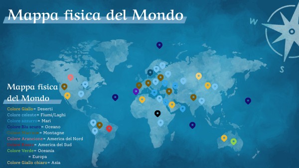 Colore Giallo= DesertiColore celeste= Fiumi/Laghi Colore azzurro= Mari Colore Blu scuro= Oceano Colore Marrone= Montagne Colore Arancione= America del Nord Colore Rosso= America del Sud Colore Verde= Oceania Colore Blu= Europa Colore Giallo chiaro= Asia