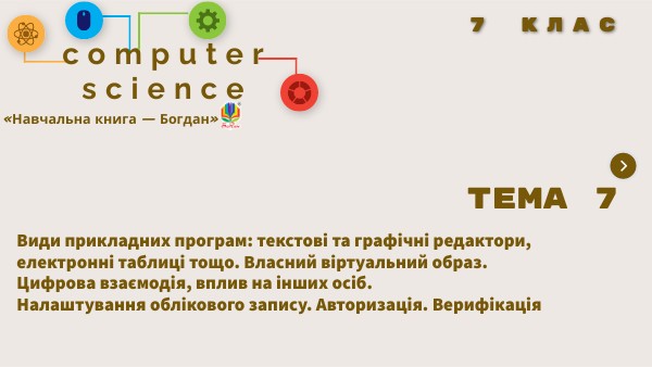Види прикладних програм: текстові та графічні редактори, електронні таблиці тощо. Власний віртуальний образ. Цифрова взаємодія, вплив на інших осіб. Налаштування облікового запису. Авторизація. Верифікація