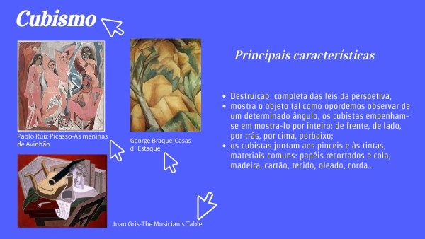 - mostra o objeto tal como opordemos observar de um determinado ângulo, os cubistas empenham-se em mostra-lo por inteiro: de frente, de lado, por trás, por cima, porbaixo;