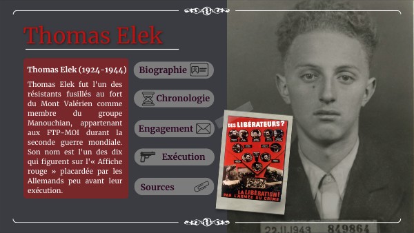 Thomas Elek est connu comme un des dix visages emblématiques de l'Affiche Rouge. Sa photo accompagne la mention poignante « ELEK Juif hongrois 8 déraillements ».